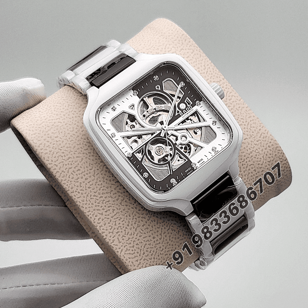 Rado True Square White and Black Open Heart Diamonds High Quality Swiss Automatic Movement Watch